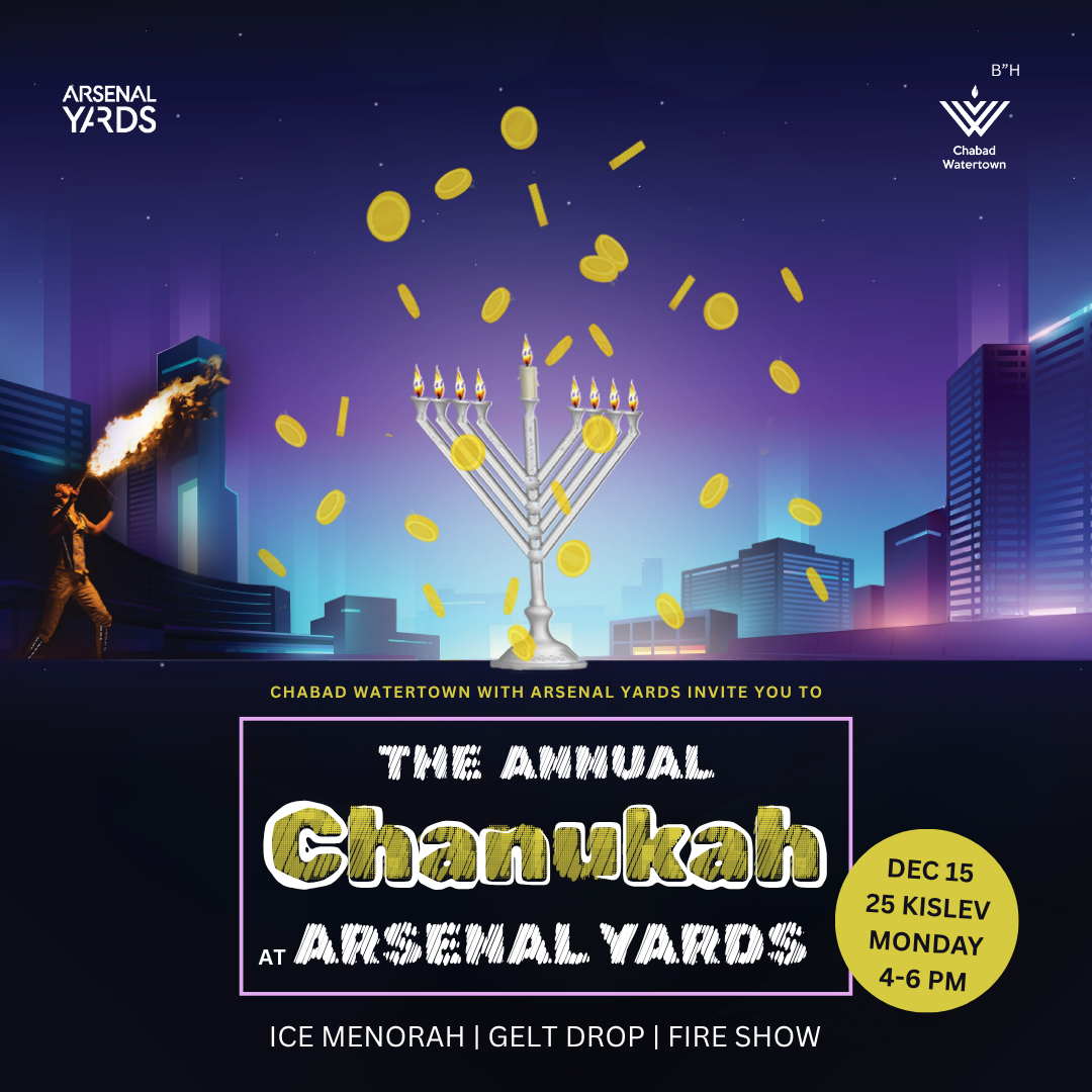 Celebrate the Festival of Lights with joy and community spirit at Arsenal Yards! Join Chabad Watertown and Arsenal Yards on Monday, December 15, 25 Kislev from 4–6 PM for an unforgettable evening featuring a dazzling ice menorah lighting, an exciting gelt drop, and a thrilling fire show. This festive event is free and open to all. Come share in the warmth, light, and unity of Chanukah right in the heart of Watertown!