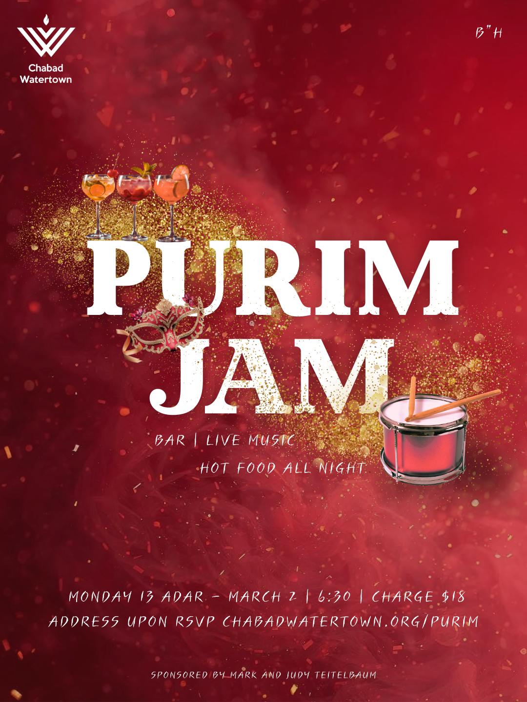 Grab a mask, bring your friends, and get ready for Purim Jam — a Purim party with a full bar, live music vibes, and hot food all night. Come in costume, stay for the energy, and celebrate Purim the Chabad Watertown way.